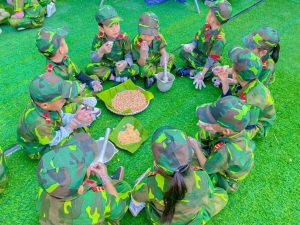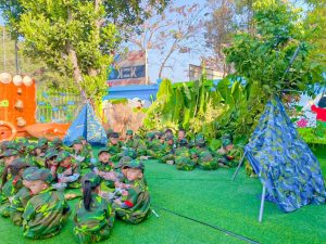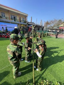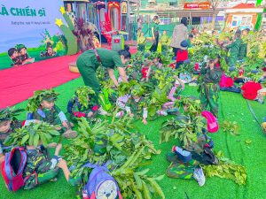 Các bé hào hứng tham gia các trò chơi như: Ngụy trang mũ, ba lô; ngụy trang xe đạp; dựng lều dã chiến; vận động liên hoàn; đánh trận giả. Qua đó rèn luyện sự khéo léo, nhanh nhẹn, tinh thần đồng đội và khả năng phối hợp nhóm.