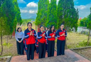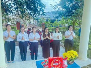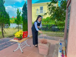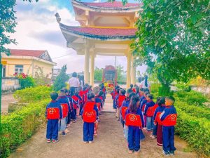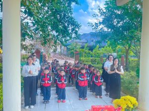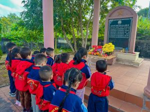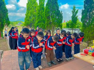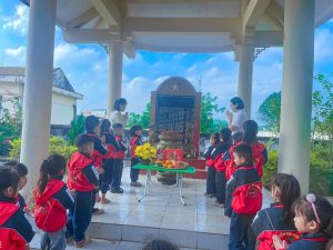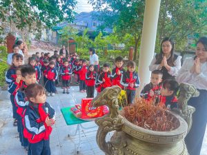 Với những bước chân nhỏ bé nhưng đầy thành kính, các con được cô giáo hướng dẫn xếp hàng ngay ngắn, nghiêm trang dâng hương, tưởng nhớ và bày tỏ lòng biết ơn sâu sắc tới các anh hùng liệt sĩ – những người đã anh dũng hy sinh vì độc lập, tự do của Tổ quốc, vì cuộc sống hòa bình hôm nay.